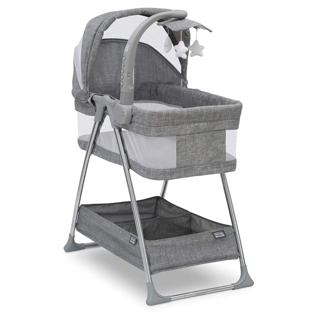 The Simmons bassinet is another option for those tech savvy parents who want all the help they can get. It offers a night light, vibrations and even a rotating mobile. There is a storage compartment where you can keep essentials handy and the bassinet is lightweight enough to be moved from one room to the next.